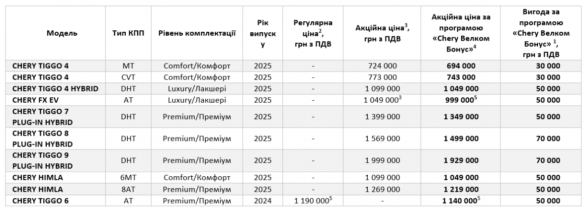 Акційні ціни діють на автомобілі CHERY TIGGO 4 HYBRID Luxury/Лакшері, CHERY FX EV Luxury/Лакшері, CHERY TIGGO 7 PLUG-IN HYBRID Premium/Преміум, CHERY TIGGO 8 PLUG-IN HYBRID Premium/Преміум, CHERY Tiggo 9 PLUG-IN HYBRID Premium/Преміум та CHERY HIMLA 2025 року виробництва, надходження яких в дилерську мережу ТОВ "СІ ЕЙ АВТОМОТІВ" очікується в період з 25.09.2025 р. по 31.12.2025 р.